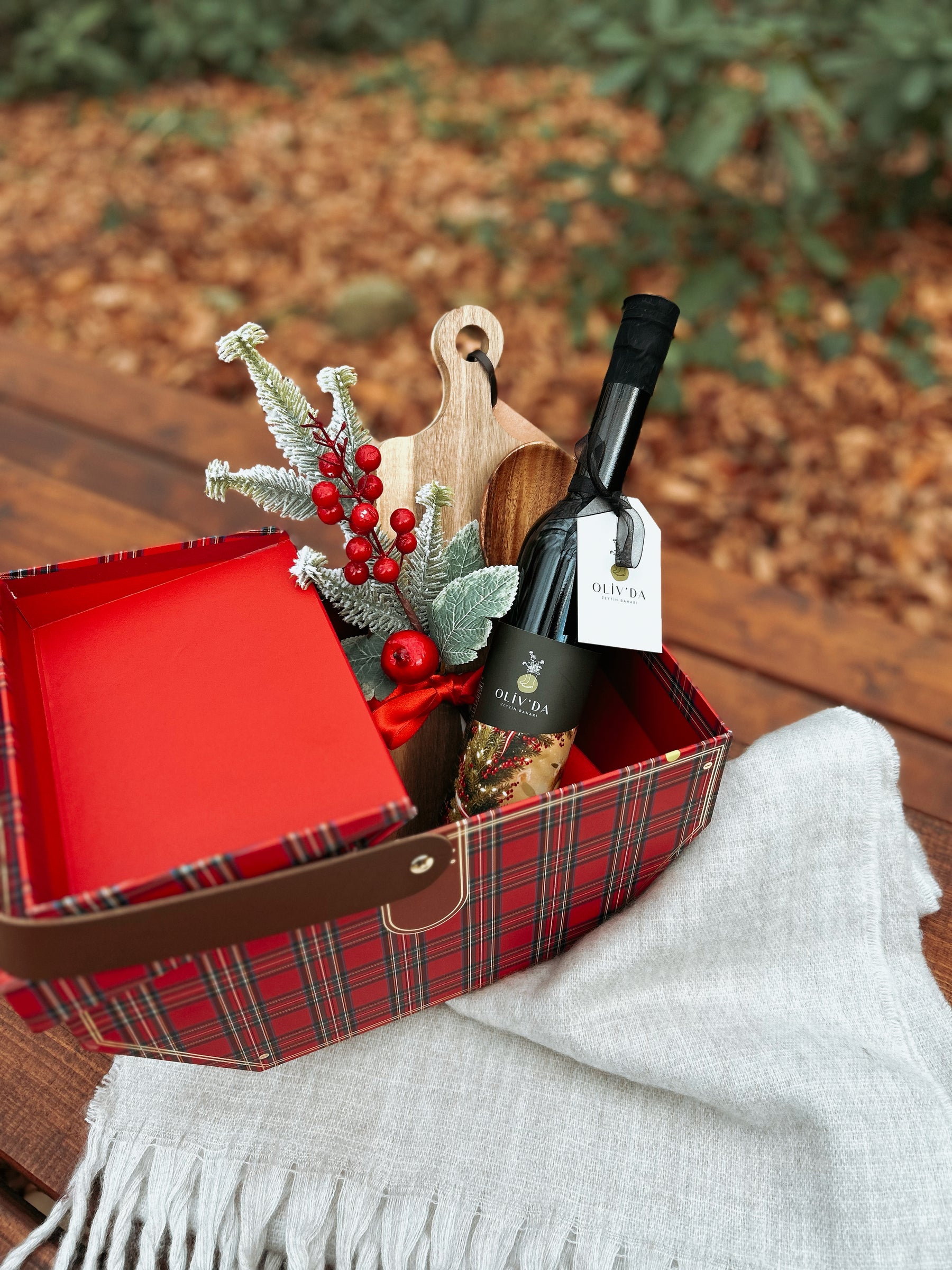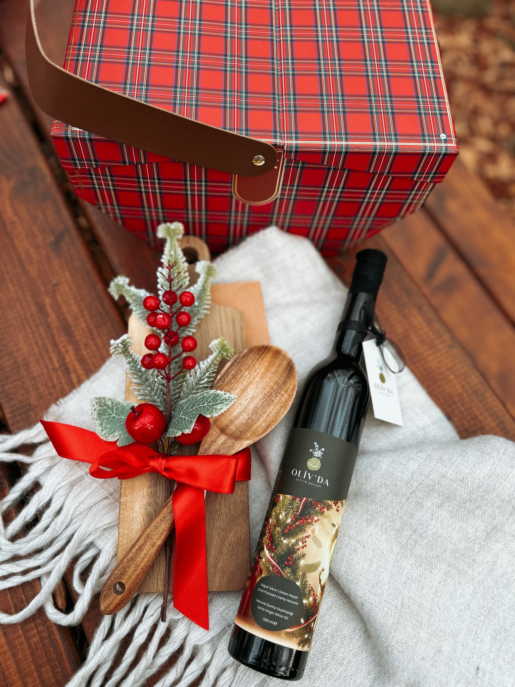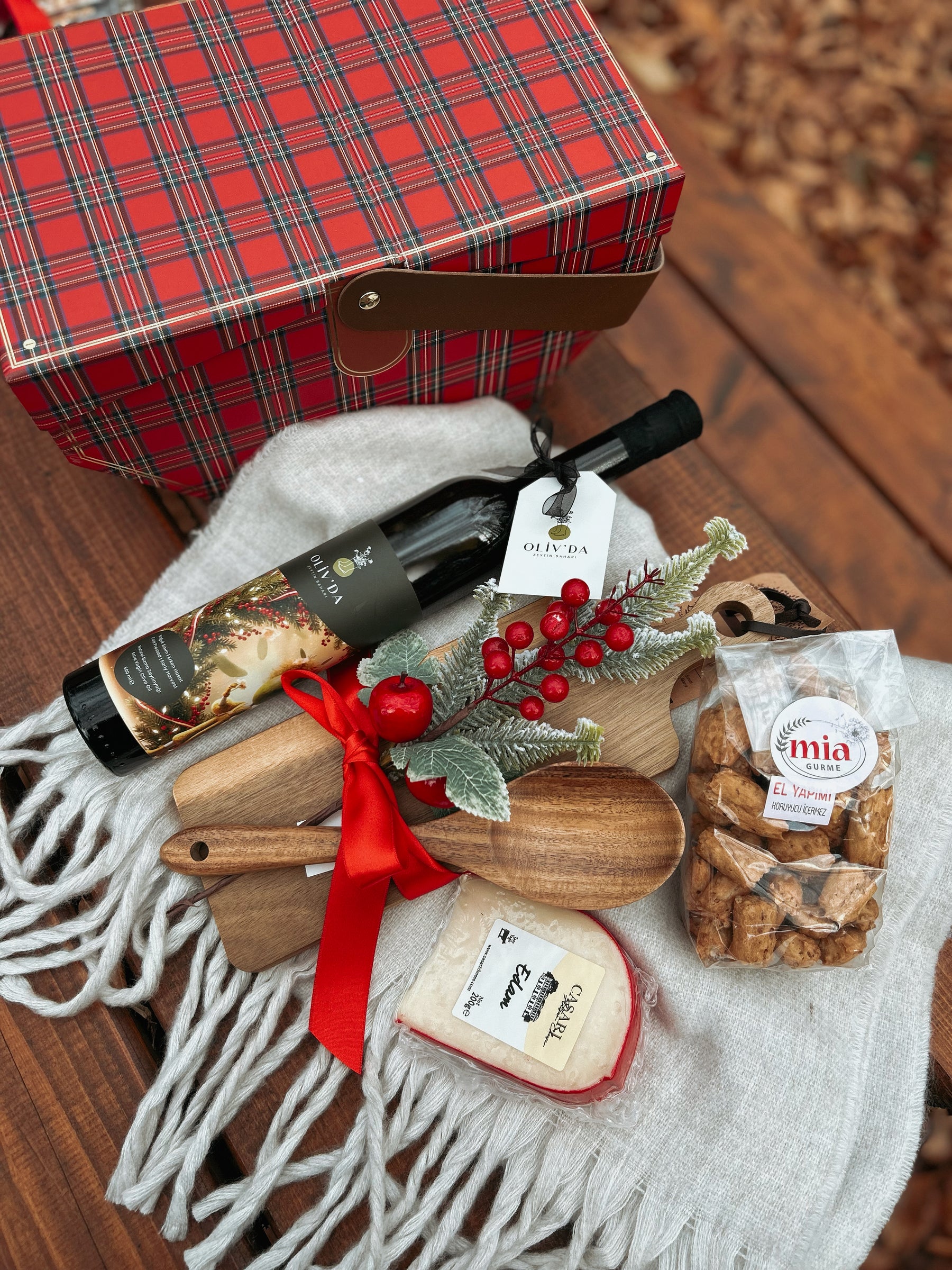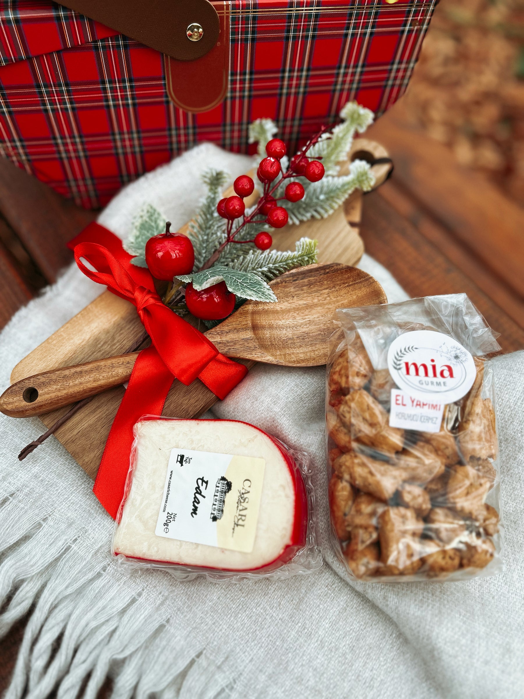 Sofralarda keyifle yerini alacak 500 ml Erken Hasat Zeytinyağı, el yapımı glutensiz tuzlu kraker, edammer peyniri, ahşap ekmek kesme tahtası, tahta kaşık, bir demet kokina ve sıcacık tutacak atkıyı sizin ve sevdikleriniz için ekose piknik sepetimizde özenle bir araya geldi.